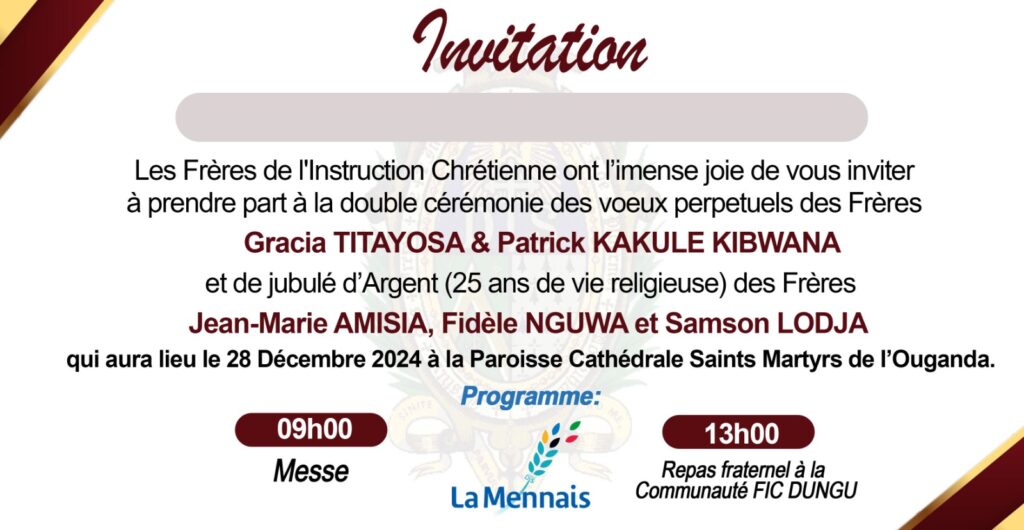 Para los 6 Hermanos ugandeses que se comprometerán definitivamente con la Congregación el 1 de enero de 2025 en Kisubi: Hnos: Alfred Mukasa, Deo Ruhweza, Julius Mandella, Leonard Ssemanda Wasswa, Noah Tutasirwe, Richard Kagoda.