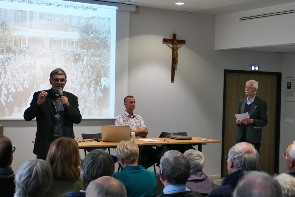 Ante una pública audiencia – un centenar de participantes – en la mediateca de la Casa diocesana de St Yves, en presencia de Mons. Moutel, obispo de St Brieuc y Tréguier, el conferenciante presentó las diferentes etapas de la vida del Padre de la Mennais en la diócesis. Comentó los años en que fue administrador diocesano, de 1814 a 1821 y a su vez, secretario de Mons. Cafarelli, Vicario capitular de 1815 a 1819 y en una situación de conflicto con Mons. de la Romagère.
