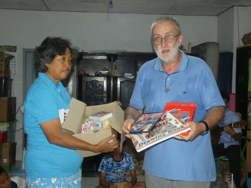 A gauche, Frère Daniel remettant les cadeaux à une responsable de l’orphelinat et à droite, le Frère Zeno, responsable des Postulants 1ère année … regard complice avec un enfant